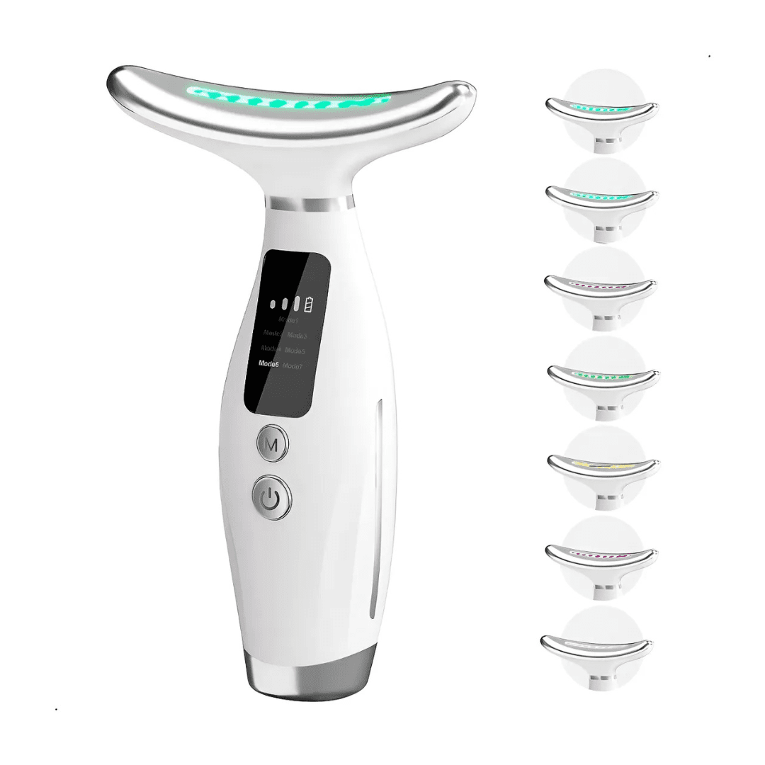 Dispositivo de belleza que combina vibración, calor constante y terapia LED para mejorar la firmeza, elasticidad y apariencia de la piel.